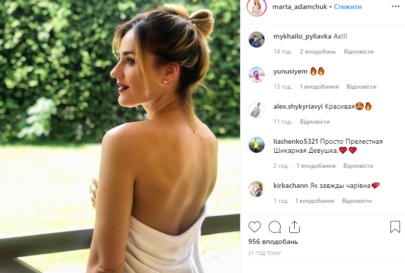 Зірка “Кварталу-95”, 33-річна Марта Адамчук, опублікувала у своєму Instagram фото, де позує повністю гола, обмотавшись лише рушником.