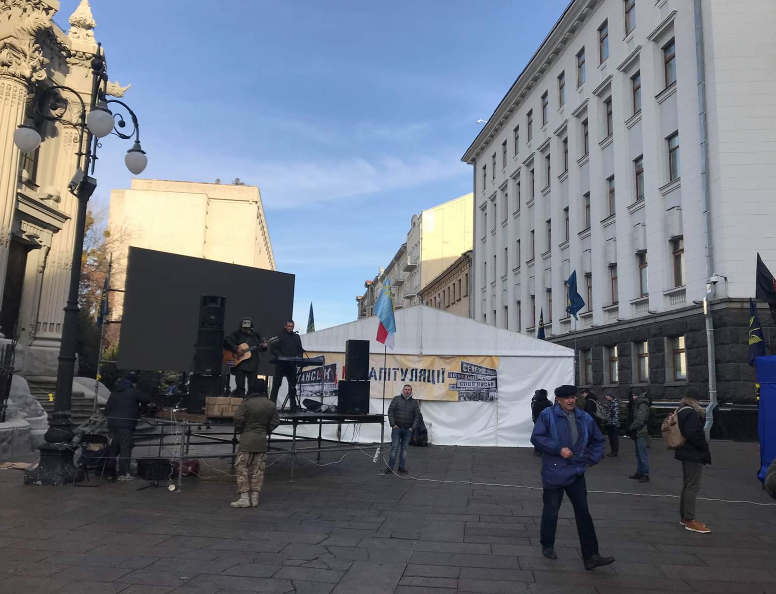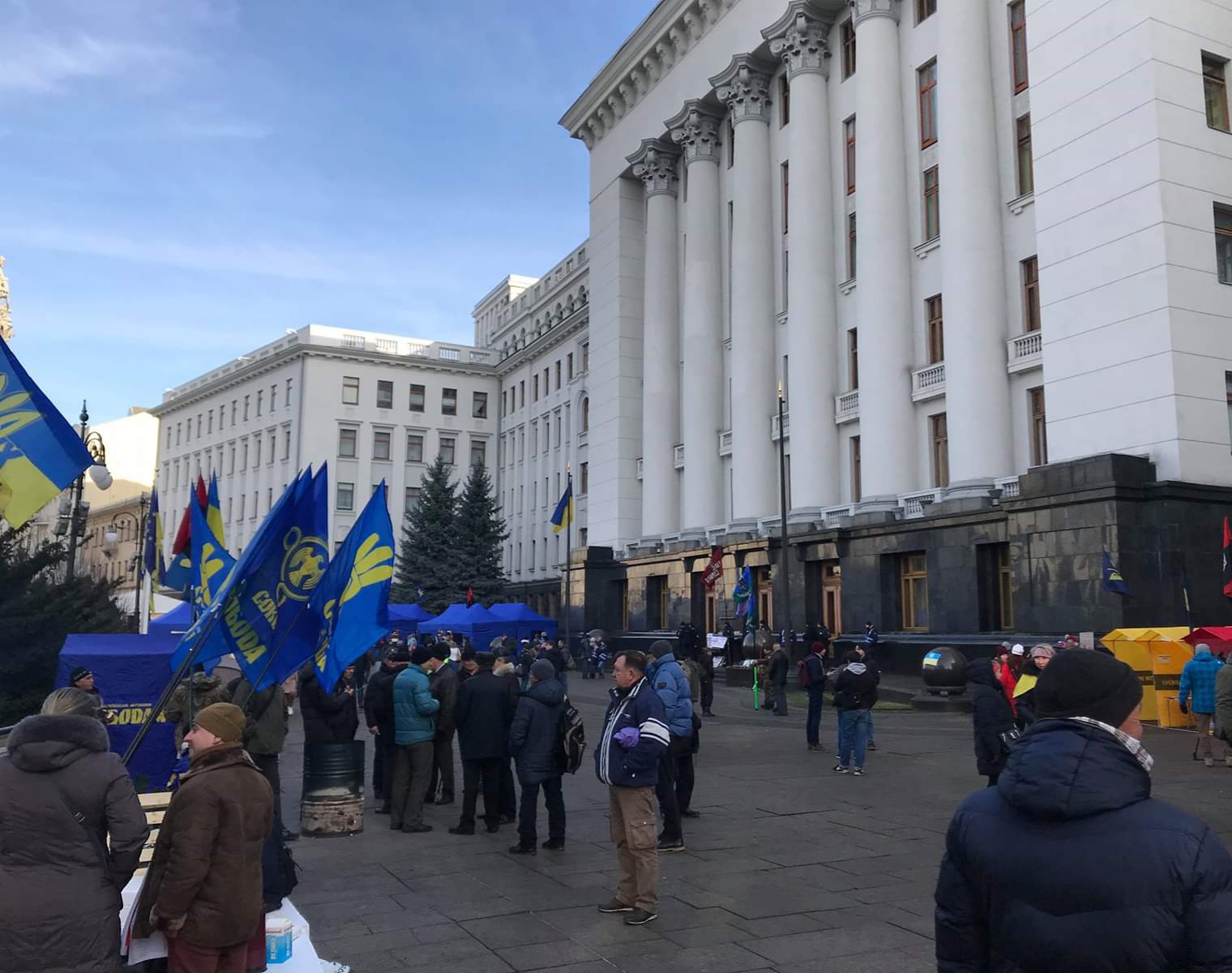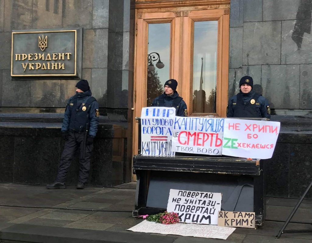 Навпроти входу в Офіс президента розміщені плакати “Мир на умовах ворога – капітуляція”, “Капітуляція – це смерть твоя, Вово!”, “Не хрипи, бо zeхекаєшся”, ” Повертай не унітази – повертай Крим”. Поблизу також встановлений пам’ятник червоній лінії.