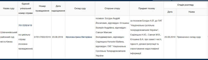 У вівторок, 20 серпня, Андрій Богдан подав позов про захист честі і гідності проти журналістів програми “Схеми” та Національної суспільної телерадіокомпанії України до Шевченківського районного суду Києва.