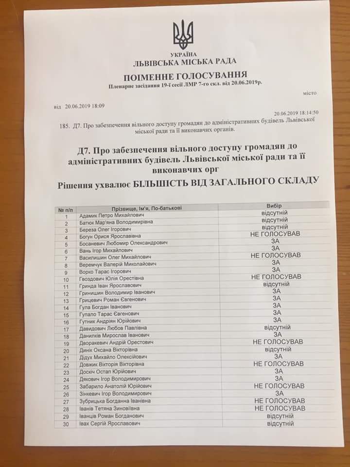 Депутати Львівської міської ради провалили голосування за відновлення вільного доступу громадян до адміністративних будівель Львівської міської ради та її виконавчих органів.