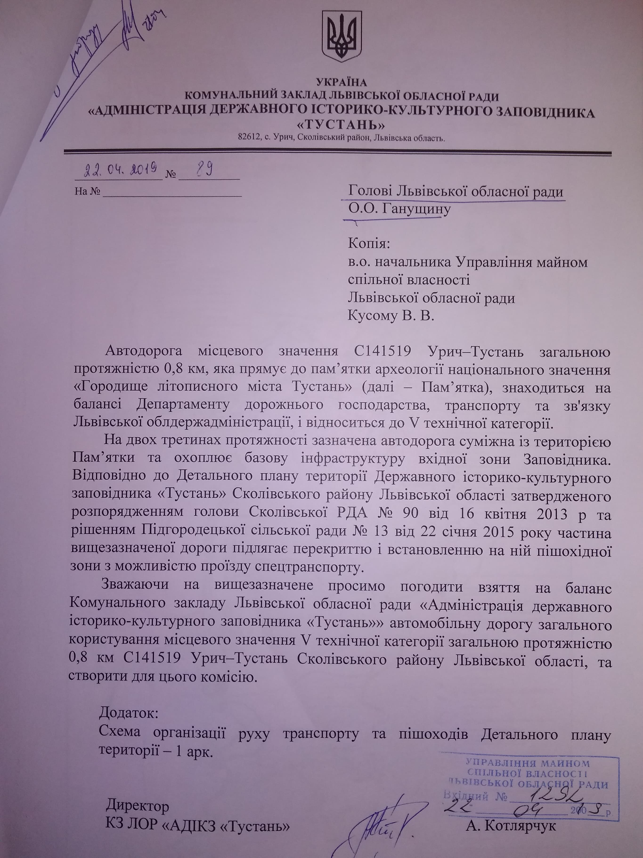 “На двох третинах протяжності зазначена автодорога суміжна із територією пам’ятки археології національного значення “Городище літописного міста Тустань” та охоплює базову інфраструктуру вхідної зони заповідника. Відповідно до детального плану території Державного історико-культурного заповідника “Тустань”, затвердженого розпорядженням голови Сколівської РДА № 90 від 16 квітня 2013 року та рішенням Підгородецької сільської ради № 13 від 22 січня 2015 року частина вищезазначеної дороги підлягає перекриттю і встановленню на ній пішохідної зони з можливістю проїзду спецтранспорту”, – йдеться у листі директора заповідника до голови Львівської обласної ради та начальника управління майном спільної власності облради.