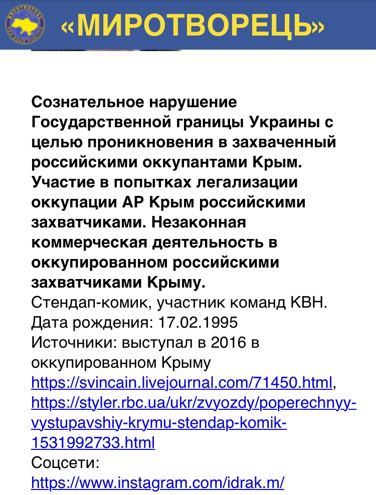 Зазначимо, що у 2016 році він мав виступ у окупованому Криму та нещодавно був поміщений до бази “Миротворець”.
