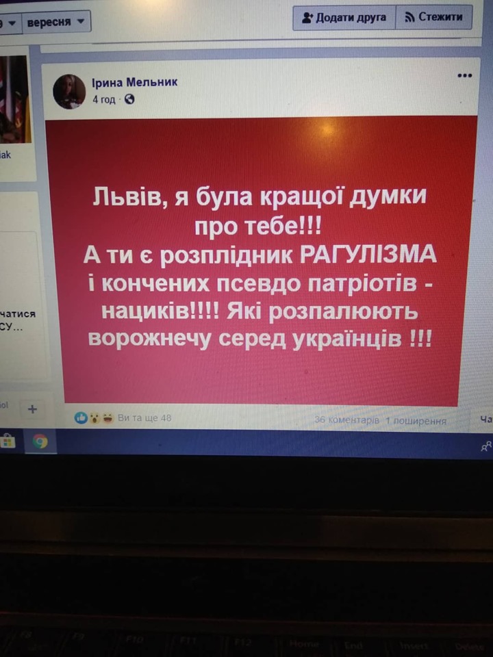 Свій допис Ірина Мельник вже видалила, однак львівські активісти встигли зробити скрін.