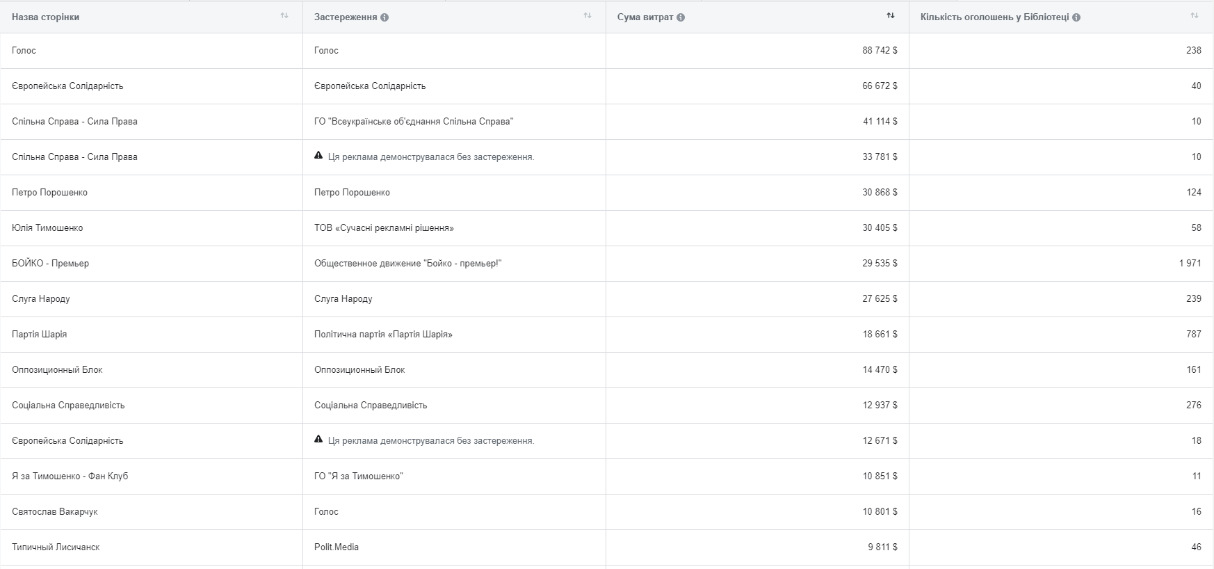 Так, наразі лідирує сторінка партії “Голос” Святослава Вакарчука. Загалом за звітний період було сплачено $91 029 за 238 оголошень. Примітно, що з цієї суми $2 287 було витрачено на рекламу, що демонструвалася без застереження. Також, окремо від “Голосу”, рекламу у фейсбуці купляв лідер партії Святослав Вакарчук. Згідно зі звітом, він від червня витратив $11 658 на 16 оголошень.