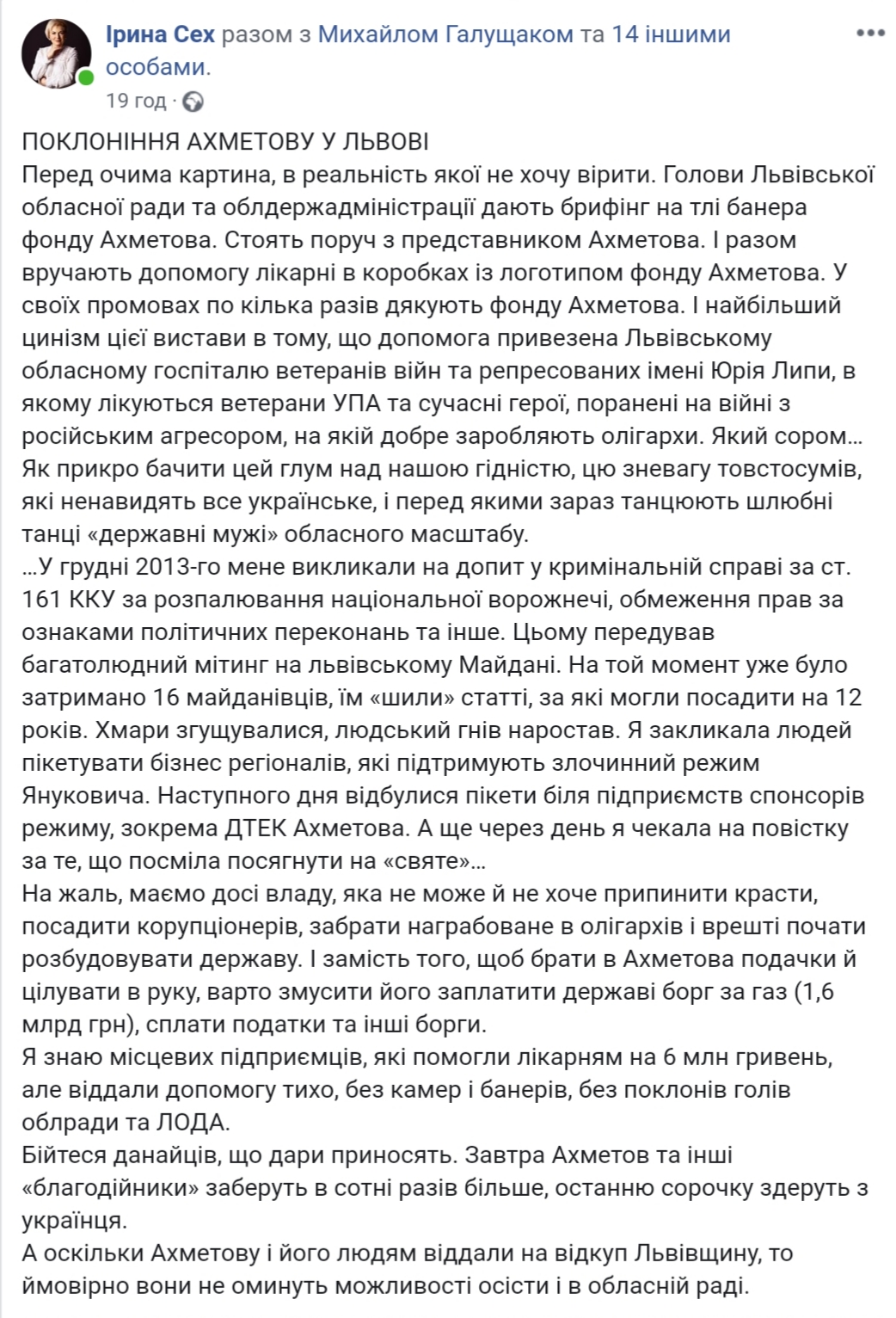 “На жаль, маємо досі владу, яка не може й не хоче припинити красти, посадити корупціонерів, забрати награбоване в олігархів і врешті почати розбудовувати державу, – зазначила громадська діячка. І замість того, щоб брати в Ахметова подачки й цілувати в руку, варто змусити його заплатити державі борг за газ (1,6 млрд грн), сплати податки та інші борги. Я знаю місцевих підприємців, які помогли лікарням на 6 млн гривень, але віддали допомогу тихо, без камер і банерів, без поклонів голів облради та ЛОДА. Бійтеся данайців, що дари приносять. Завтра Ахметов та інші «благодійники» заберуть в сотні разів більше, останню сорочку здеруть з українця. А оскільки Ахметову і його людям віддали на відкуп Львівщину, то ймовірно вони не оминуть можливості осісти і в обласній раді”.