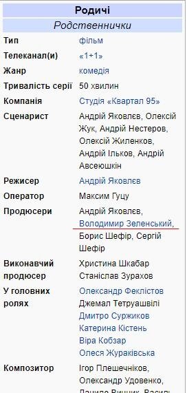 Крім того, “Вікіпедія” прямо вказує Володимира Зеленського продюсером “Родичів”.