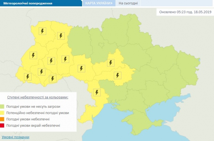 Згідно з даними синоптиків, 18 травня короткочасні дощі, грози та місцями шквали 15-20 м/с очікуються у західних, більшості центральних областей та на Одещині. У решті регіонів – сонячно, вдень від +24 до +29 градусів.