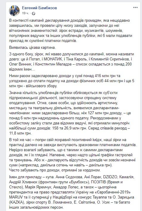 Виконуючий обов’язки заступника Голови ГФС України Євген Бамбизов розповів, що в контексті кампанії декларування доходів громадян було проведено ряд заходів за участю музикантів, шоуменів і зірок естради, які мали б подавати приклад як сумлінні платники податків. Відповідний пост він опублікував Facebook.