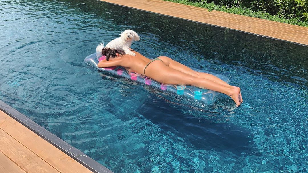 Світлина була зроблена під медового місяця зіркової пари. На ній дівчина засмагає в одних лише плавках, а поруч з нею на матраці сидить її собака.