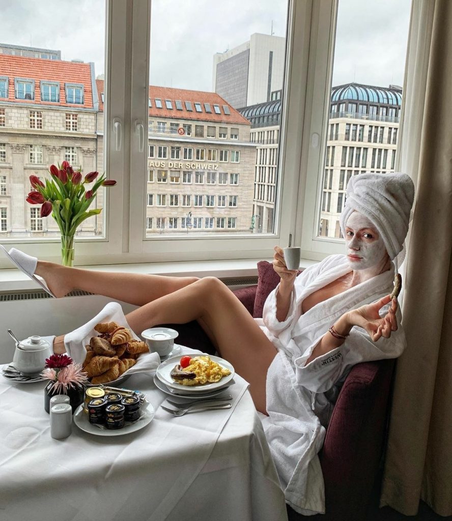 На світлині Нікитюк сидить у кріслі біля вікна за сніданком. В одній руці у неї чашка кави, в іншій – німецька ковбаска. Накинувши на себе халат, телеведуча продемонструвала підписникам свої довгі ноги і частину декольте.