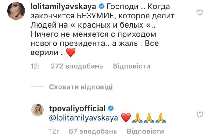 Під дописом Таїсії Повалій, про можливу відміну запланованого на грудень сольника у Палаці “Україна” Лоліта написала наступне: