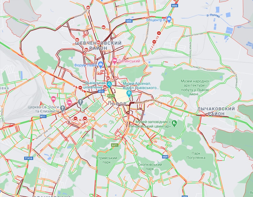 Сьогодні, у переддень свята Святого Миколая, Львів зупинився у заторах. Станом на 17:30, рух на усіх центральних вулицях міста значно сповільнений. Які вулиці краще оминати автомобілістам у місті?