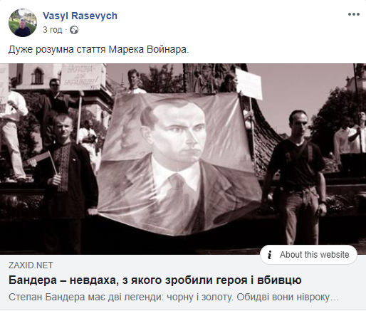 Також автор поширює в себе на сторінці матеріали, які дискридетують Степана Бандеру.