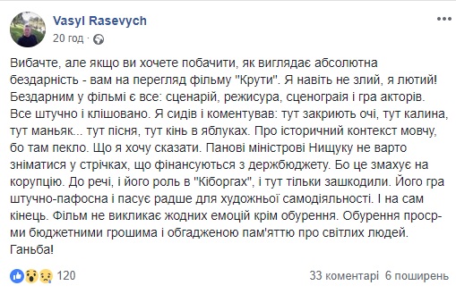 “Вибачте, але якщо ви хочете побачити, як виглядає абсолютна бездарність – вам на перегляд фільму “Крути”. Я навіть не злий, я лютий! Бездарним у фільмі є все: сценарій, режисура, сценограія і гра акторів. Все штучно і клішовано. Я сидів і коментував: тут закриють очі, тут калина, тут маньяк… тут пісня, тут кінь в яблуках. Про історичний контекст мовчу, бо там пекло. Що я хочу сказати. Панові міністрові Нищуку не варто зніматися у стрічках, що фінансуються з держбюджету. Бо це змахує на корупцію. До речі, і його роль в “Кіборгах”, і тут тільки зашкодили. Його гра штучно-пафосна і пасує радше для художньої самодіяльності. І на сам кінець. Фільм не викликає жодних емоцій крім обурення. Обурення проср-ми бюджетними грошима і обгадженою пам’яттю про світлих людей. Ганьба!”