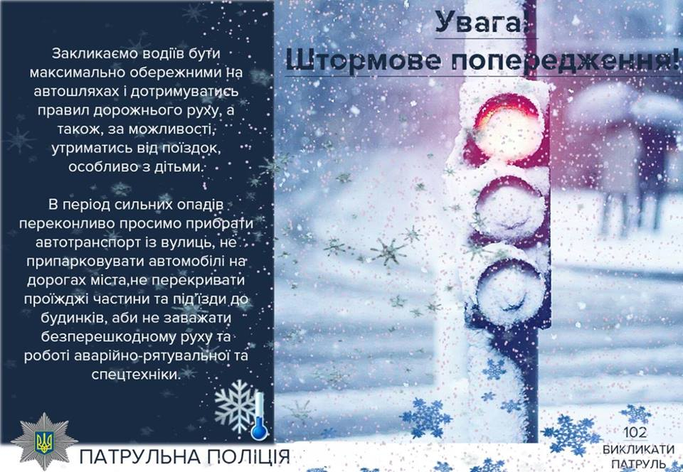 За інформацією гідрометеоцентру, впродовж наступної доби збережуться хуртовини, пориви сильного вітру, ожеледиця. Такі погодні умови можуть призвести до ускладнень в роботі служб електропостачання, комунального господарства, будівельної галузі та порушення руху автотранспорту на окремих ділянках доріг і вулиць. Патрульна поліція зробить все можливе аби допомогти учасникам дорожнього руху в складних ситуаціях. Якщо від поїздки неможливо утриматися, то подбайте про власну безпеку!