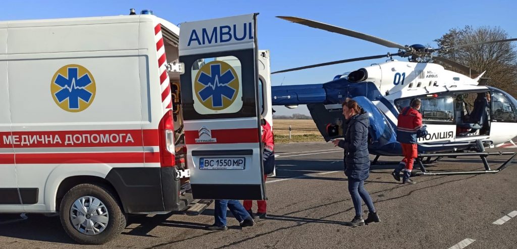 Чоловіка з травмою голови було терміново доставлено до медичного закладу у Львові поліцейським гелікоптером Airbus Helicopters Н-145.