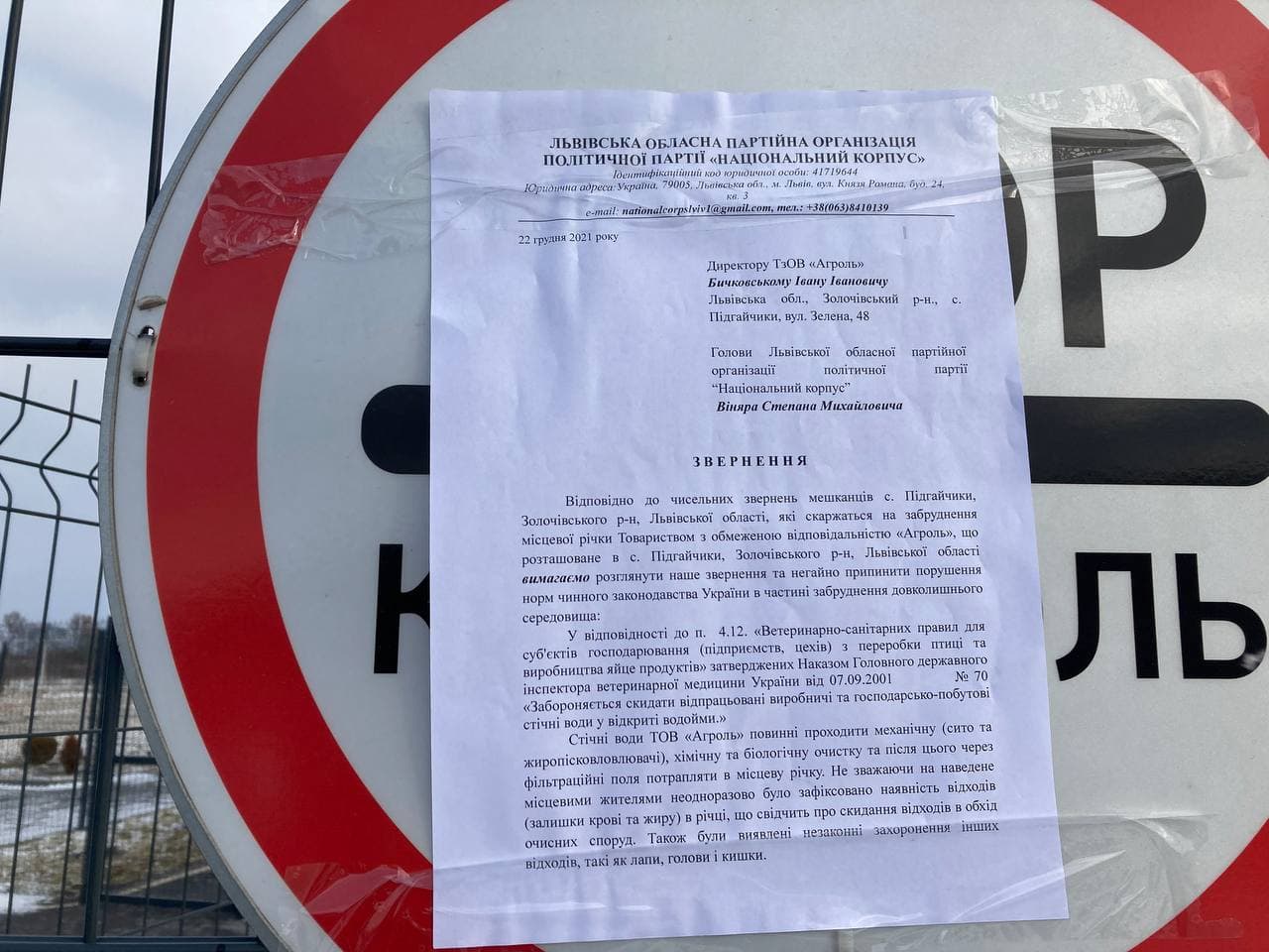 Сьогодні, 22 грудня, у селі Підгайчики, що на Львівщині активісти Національного Корпусу і проекуту “Екокульт” проевели акцію під птахофермою “Агроль”. Протестувальники вимагали припинити злив відходів у місцеву річку та вивіз відходів у поля, про які сповістили мешканці села.