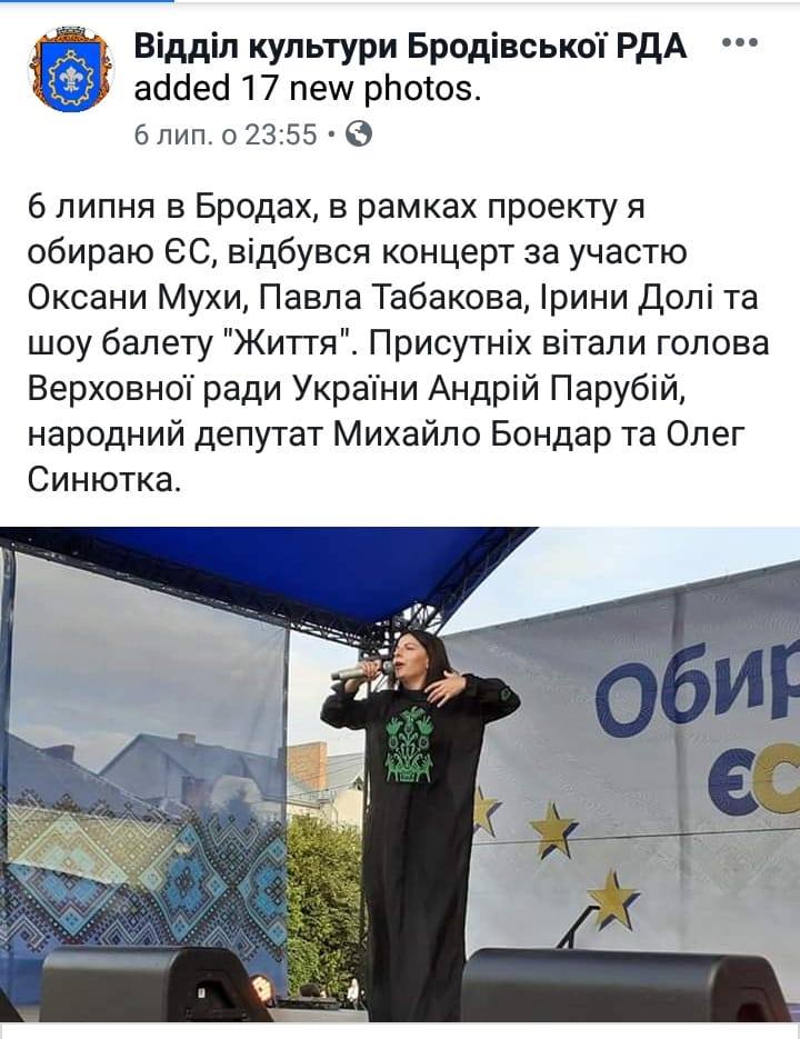 Відділ культури Бродівської РДА 6 липня розмістив на своїй сторінці у facebook інформацію про концерт партії Європейська солідарність Порошенка, яий відбувся у Бродах.