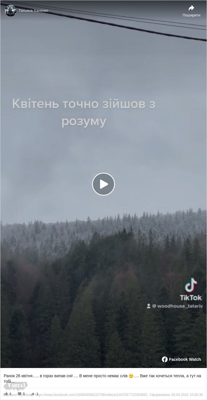 «Тим часом на горі Тростян випав сніг. 26.04.2023», написав у коментарі до оприлюдненої світлини Андрій Великий на сторінці «ОТГ Славське» у ФБ.