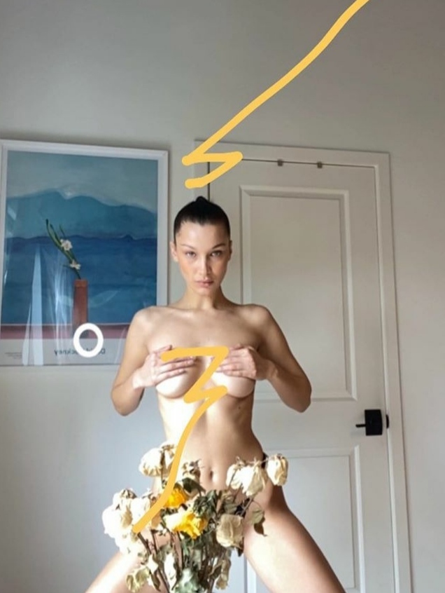 Ці світлини зробили на черговій фотосесії. На одних фото Белла позує оголеною, прикриваючись букетом сухих квітів, який поміщений у скляну вазу. На інших кадрах – зображена топлес, затуляючи груди босоніжками на шпильці.