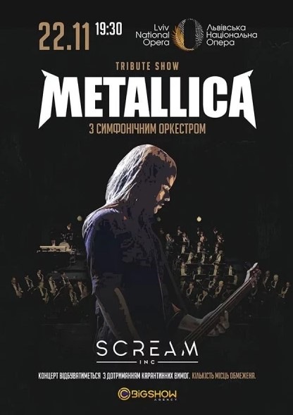 Metallica Symphonic Tribute – це не звичайний триб’ют-концерт маловідомої групи, яка грає музику всесвітньо відомого гурту. Це справжній офіційний проєкт, створений у 2015 році українськими музикантами разом з європейськими продюсерами. Сам гурт Scream Inc існує вже більше 10 років, і раніше він грав хіти Metallica у місцевих клубах. Але зараз він отримав світове визнання і наживо грає легендарну музику у супроводі симфонічного оркестру у багатьох країнах. На вас чекає ні з чим не зрівнянні враження від об’ємного звуку, які створює акустика оперного театру, та мурашки по всій шкірі.