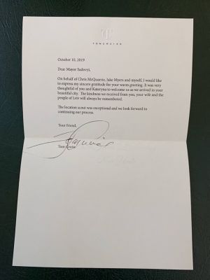 “Шановний мере Садовий! Від свого імені та від імені сценариста Кріса МакКворі і продюсера Джека Маєрса щиро дякую Вам за теплий прийом. Було дуже мило з вашого боку і з боку Катерини прийняти нас, коли ми відвідали ваше красиве місто. Ми завжди будемо пам’ятати доброту та турботу, яку ми отримали від вас, вашої дружини та мешканців Львова. Вибір локацій був винятковим і ми сподіваємось продовжити цей процес”, – сказано у листі.