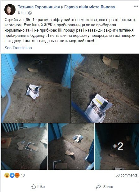 “Стрийська ,65. 10 ранку, з ліфта вийте не можливо, все в рвоті, накритий картоном. Вже інший ЖЕК,а як прибиральниця не прибирала нормально,так і не прибирає !!!! прошу раз і назавжди закрити питання прибирання в будинку . І не тільки на першому поверсі,але і всі поверхи і сходову. Там вже тиждень лежить мертвий голуб”,- поскаржилася на своїй сторінці в Facebook Тетяна.