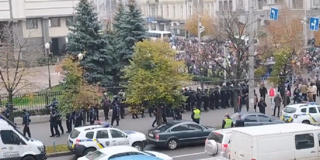 Пікетувальники біля будівлі Конституційного суду України, які вийшли на протест проти рішення щодо скасування кримінальної відповідальності за недостовірне декларування, намагаються прорватися всередину. Люди скандують: “Відкривай!”.