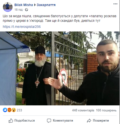 Напередодні місцевих виборів у місті Ужгороді місцевий священик Московського патріархату отець Сидор на території церкви агітує за проросійську партію ОПЗЖ. Для цього він навіть поставив біля храму агітаційний намет.