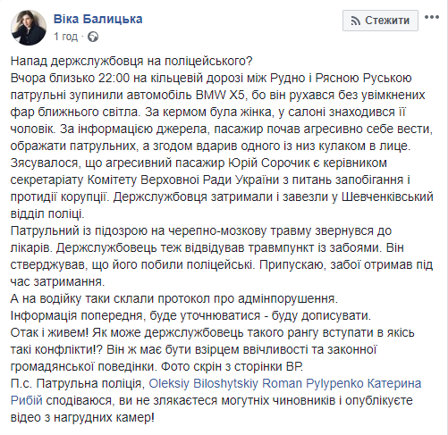Вчора близько 22:00 на кільцевій дорозі між Рудно і Рясною Руською патрульні зупинили автомобіль BMW X5, бо він рухався без увімкнених фар ближнього світла. За кермом була жінка, у салоні знаходився її чоловік. За інформацією джерела, пасажир почав агресивно себе вести, ображати патрульних, а згодом вдарив одного із низ кулаком в лице. Зясувалося, що агресивний пасажир Юрій Сорочик є керівником секретаріату Комітету Верховноі Ради України з питань запобігання і протидії корупції. Держслужбовця затримали і завезли у Шевченківський відділ поліці.