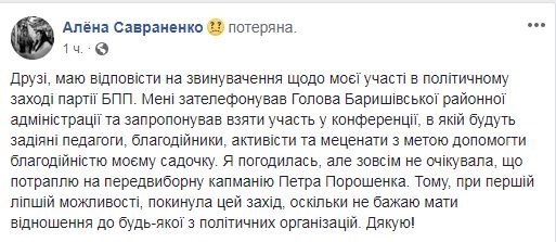 Alyona Alyona засвітилася на недавньому форумі Порошенка, але стверджує, що її заманили обманом. Співачка написала, що її запросили на зустріч з педагогами, активістами та меценатами, щоб допомогти дитячому садку, в якому вона працювала. Голова Баришівської РДА Олег Левченко стверджує, що співачка про все знала. Чоловік каже, що особисто зателефонував дівчині, пояснив всі деталі заходу, в тому числі і політичні, вручив запрошення і відвіз до Києва.