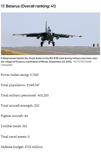 Білорусія займає 17 місце за потужністю армії у рейтингу всіх Європейських країн. А в нашому рейтингу серед армій сусідів України займає 5 місце.