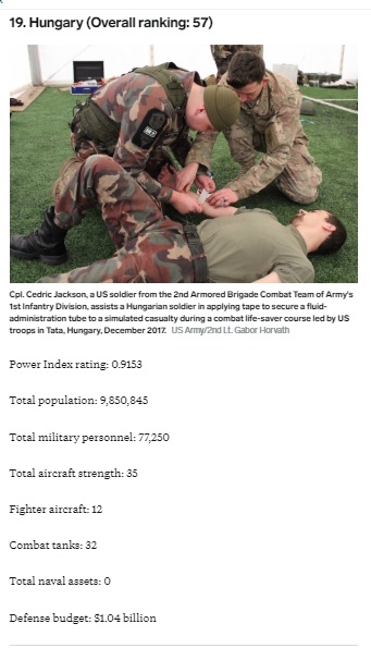 Як би окремі угорці не “горіли” сепаратизмом і бажанням забрати Закарпаття, та потужність їхньої армії бажає кращого. У європейському рейтингу ця країна займає 19 позицію. В нашому рейтингу Угорщина посідає аж 6 місце.