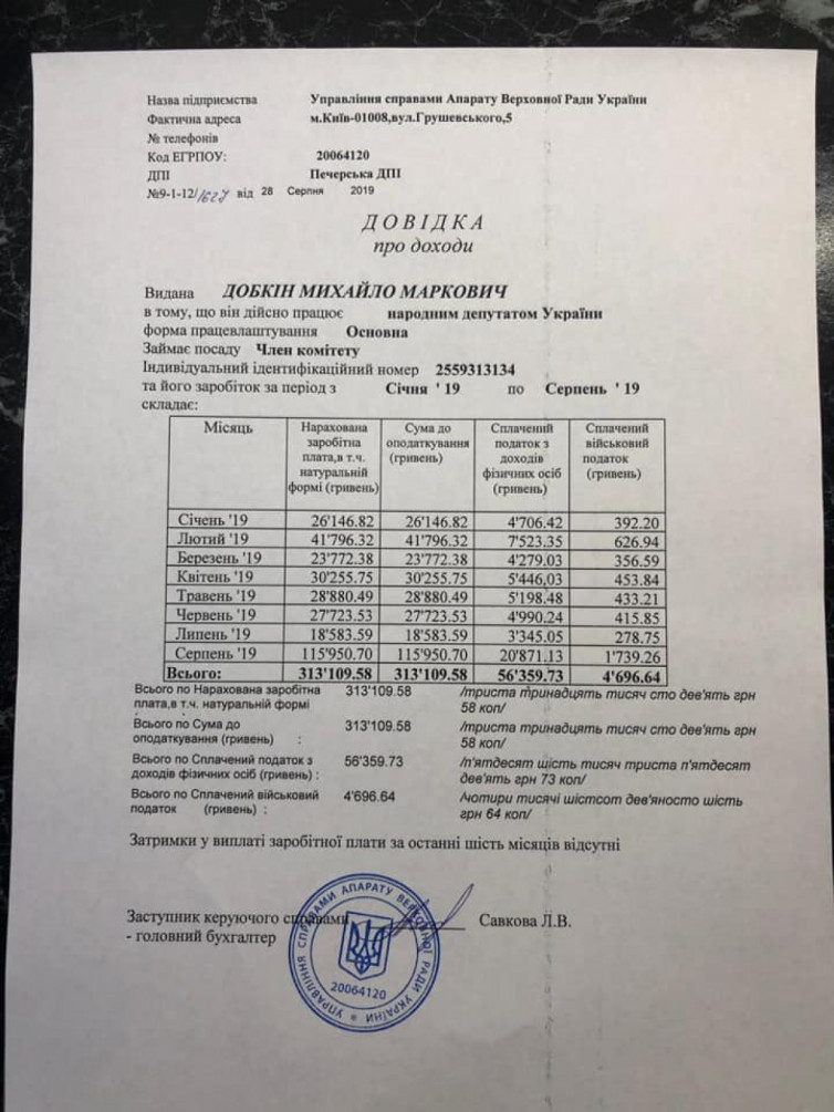 З січня по серпень 2019 року Михайлу Добкіну нарахували за діяльність в якості депутата Верховної Ради 128,6 тис. грн