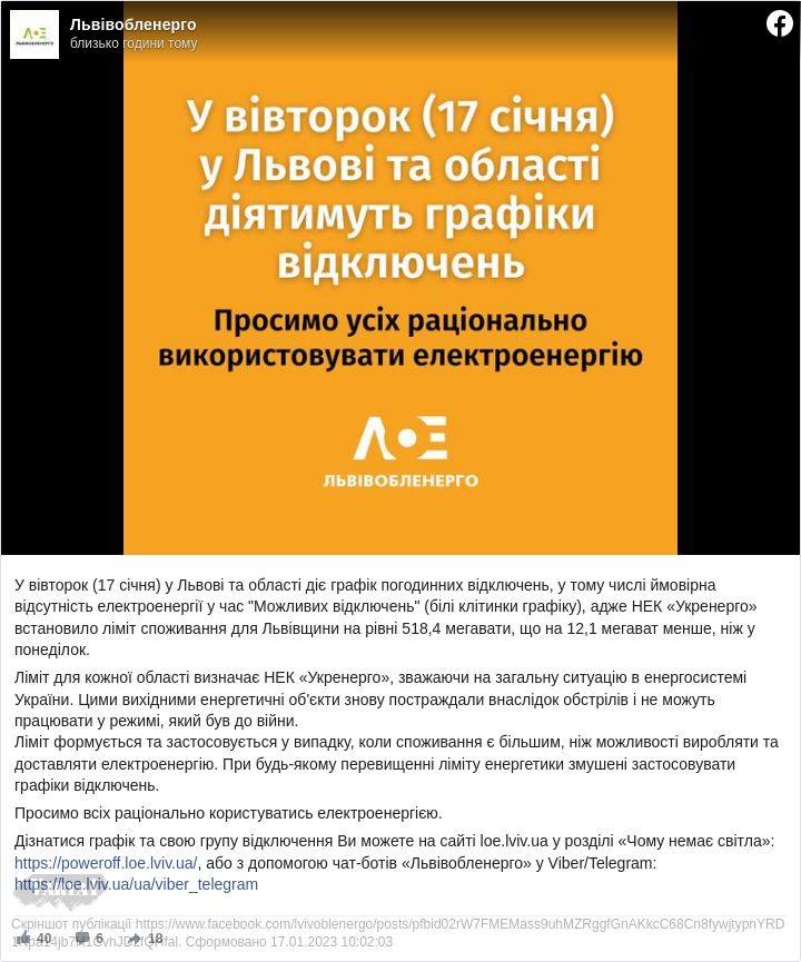Станом на цю мить на Львівщині застосовують графік погодинних відключень електроенергії. Як додають у «Львівобленерго», сьогодні є більша ймовірність відключення електроенергії у ті години, які позначені у графіку білим кольором, оскільки НЕК «Укренерго» встановила ліміт споживання для Львівщини на рівні 518,4 мегавати, що на 12,1 мегават менше, ніж учора.