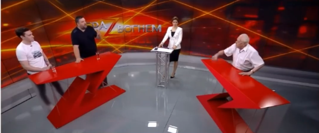Степан Хмара на ефірі телеканалу Зік облив водою блогера Андрія Полтаву.