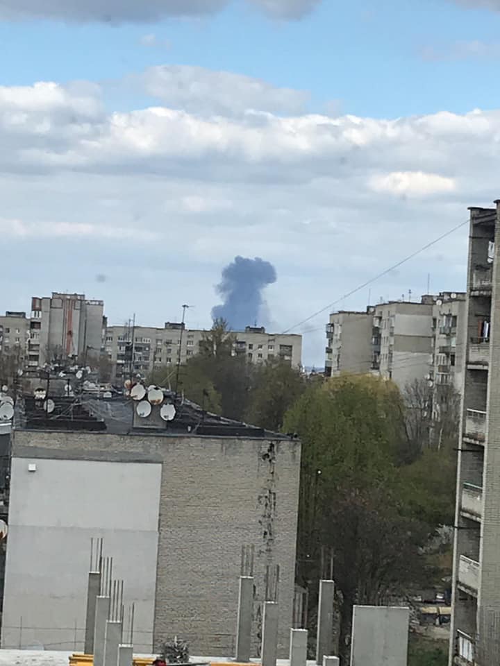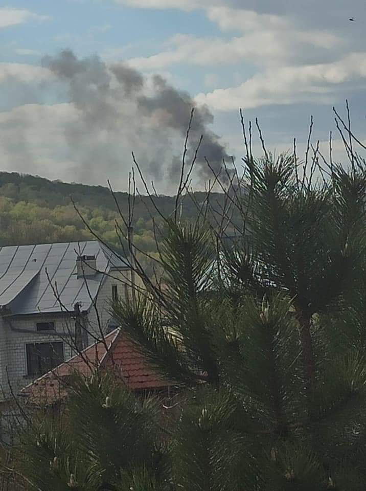 На фото помітний великий стовп чорного диму, який іде з напрямку Грибовицького сміттєзвалища. Наразі не відомо, що саме горить.