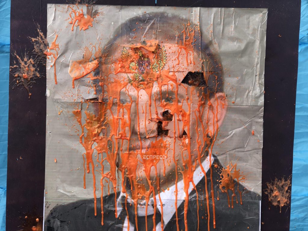 Під будинком суду відбувається акція підтримки Кіпіані та видавництва. Активісти зіграли міні-виставу, яка зображала суд над Медведчуком. Після “суду” портрет Медведчука розстріляли з пейнтбольних рушниць.