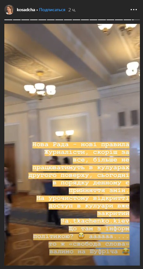 “Нова рада – нові правила. Журналісти, швидше за все, більше не будуть працювати в кулуарах другого поверху, сьогодні на порядку денному є прийняття змін…. на урочистому відкритті доступ в кулуари вже закрито…. Ааа… це ж “свобода слова”, валимо на Шуфрича”, – пише Осадча.
