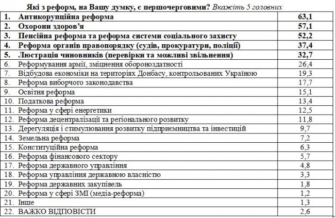 У відсоткових показниках картина вимальовується наступна:за антикорупційну реформу виступають 63% опитаних громадян, охорони здоров’я – 57%, пенсійну реформу та реформу системи соціального захисту – 52%, реформу органів правопорядку – судів, прокуратури, поліції – 37%, люстрацію чиновників – 33%.