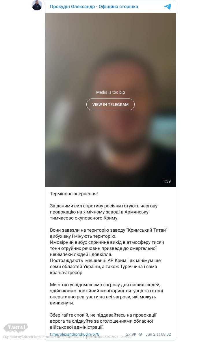 «Ми прекрасно усвідомлюємо, що спричинить ймовірний вибух на заводі – це буде другий Чорнобиль. Викид в атмосферу тисяч тонн отруйних речовин призведе до смертельної небезпеки людей і довкілля. Постраждають мешканці АР Крим і, як мінімум ще 7-ми областей України, а також Туреччина і сама країна-агресом. Мінування заводу відбувається, аби зупинити ЗСУ, а також звинуватити Україну в екологічному тероризмі. Також окупанти мають на меті здійснити військово-політичний тиск на нашу державу та світову спільноту. Україна не допустить чергового екологічного шантажу», – сказав Прокудін.