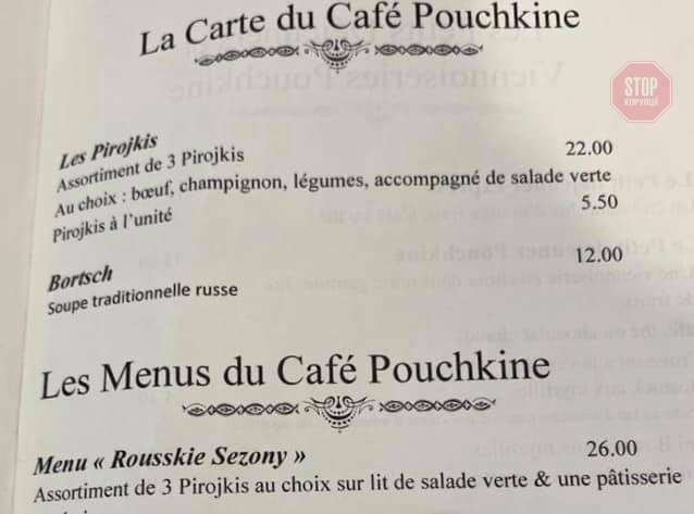 “Здається, особливо палкі шанувальники та лобісти “русського міра” серйозно взялися за гастрономію. Вже не вперше помічаємо випадки, коли накидають оком на український борщ, називаючи його “традиційним російським супом”. Ось так, наприклад, вводять в оману довірливих гурманів у Cafe Pouchkine у центрі Парижа”, — повідомляється з посиланням на пресслужбу посольства України у Франції.