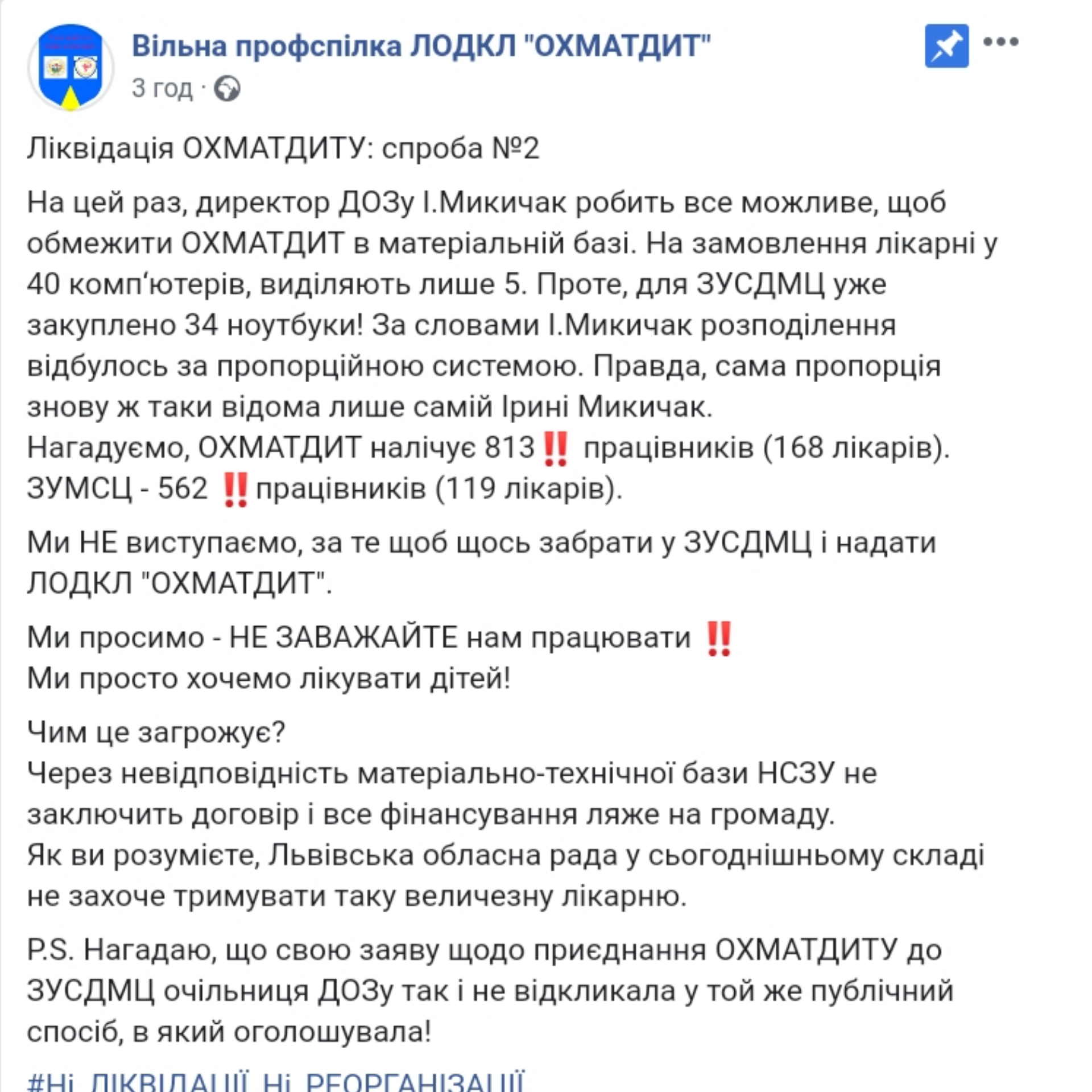 “На цей раз, директор ДОЗу І.Микичак робить все можливе, щоб обмежити ОХМАТДИТ в матеріальній базі. На замовлення лікарні у 40 комп‘ютерів, виділяють лише 5. Проте, для Західноукраїнського спеціалізованого дитячого медичного центру уже закуплено 34 ноутбуки! За словами І.Микичак розподілення відбулось за пропорційною системою. Правда, сама пропорція знову ж таки відома лише самій Ірині Микичак. Нагадуємо, ОХМАТДИТ налічує 813 працівників (168 лікарів), ЗУМСЦ – 562 працівників (119 лікарів)”, – йдеться у дописі.