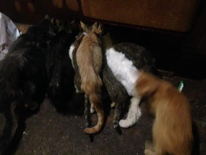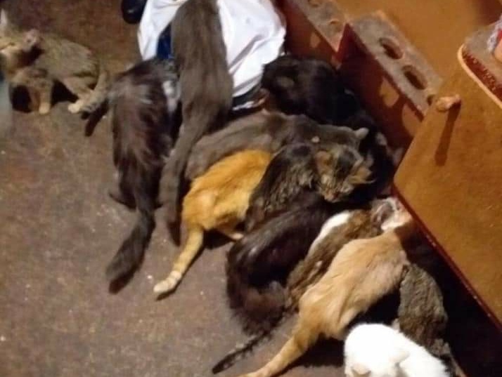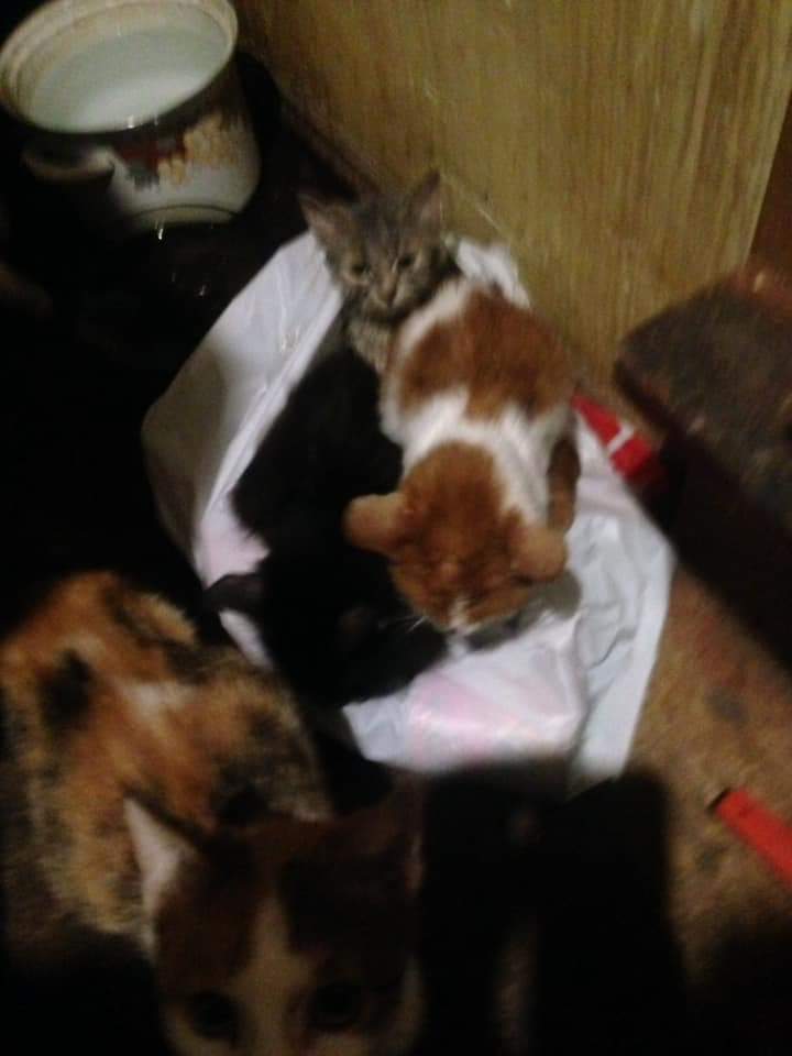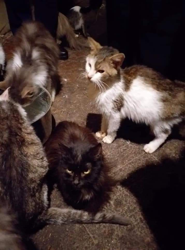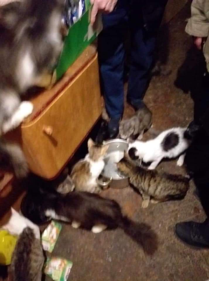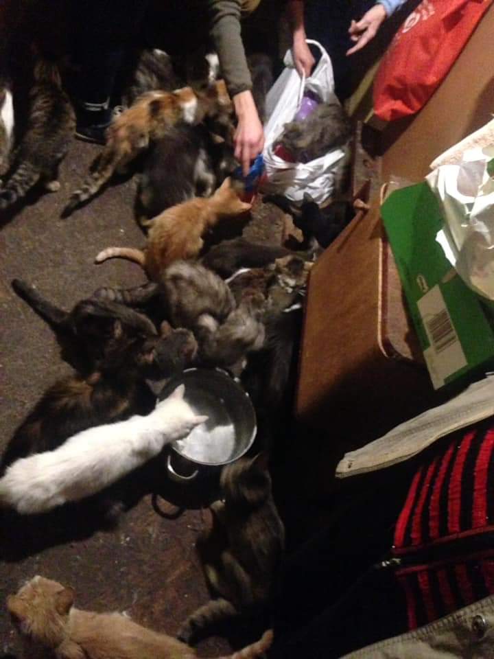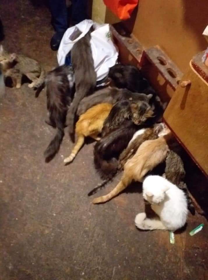 Тварини у дуже поганому стані: голодували не лише тиждень після смерті господині, але, очевидно, і довший час перед тим – анемічні, зневоднені, з роздутими животами і поганою шерстю. Багато хто на перший погляд видається кошеням, а потім виявляється дорослою кішкою-карликом. Мерзнуть, туляться одна до одної і до людей.