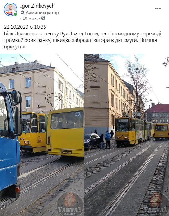 “22.10.2020 о 10:35. Біля Лялькового театру на вул. Івана Гонти, на пішоходному переході трамвай збив жінку, швидка забрала, затори в дві смуги. Поліція присутня”, – зазначається у повідомленні, де також оприлюднено світлини з місця події.