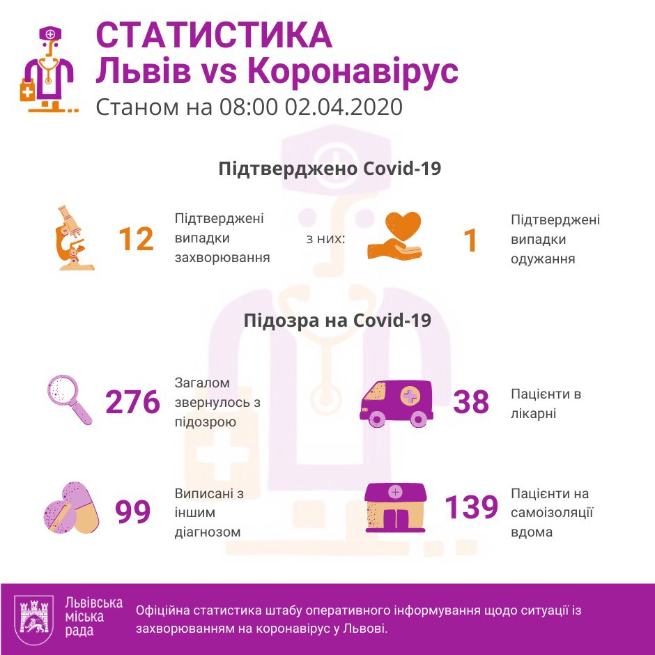 Загалом за увесь період карантину до Львівської обласної інфекційної лікарні з підозрою на коронавірус звернулось 276 людей, госпіталізовано 137 осіб, зараз у лікарні — 38 осіб, на самоізоляції — 139 осіб, виписано — 99 пацієнтів. Одна людина у важкому стані перебуває на ШВЛ. Не підтвердився діагноз інфікування коронавірусом у 171 людини, а підтвердився — у 12 осіб. Одна людина одужала