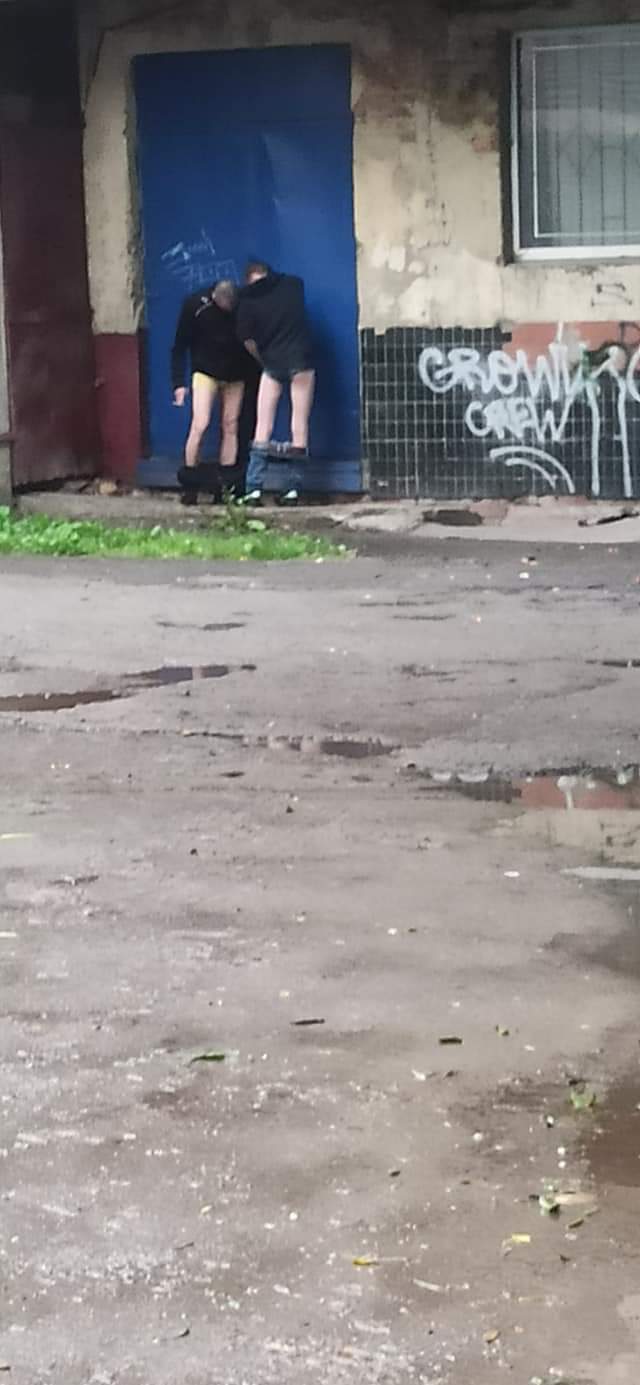 У Львові, на вул. Чорновола, 55, біля житлового будинку серед білого дня двоє чоловіків зі спущеними штанами оглядали один одного. Ймовірно перед цим вони вживали наркотики.