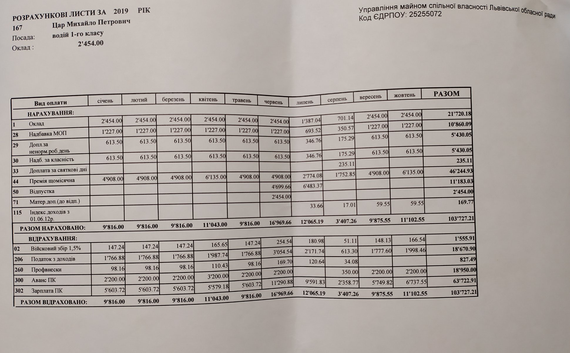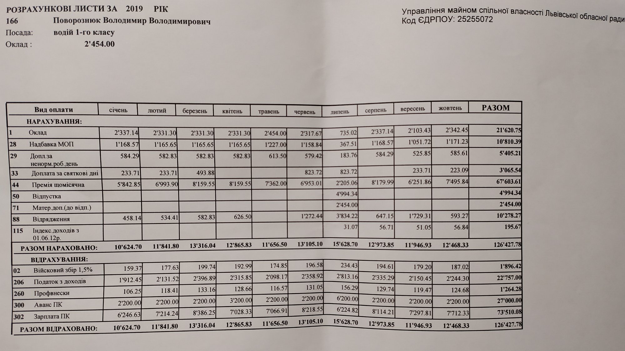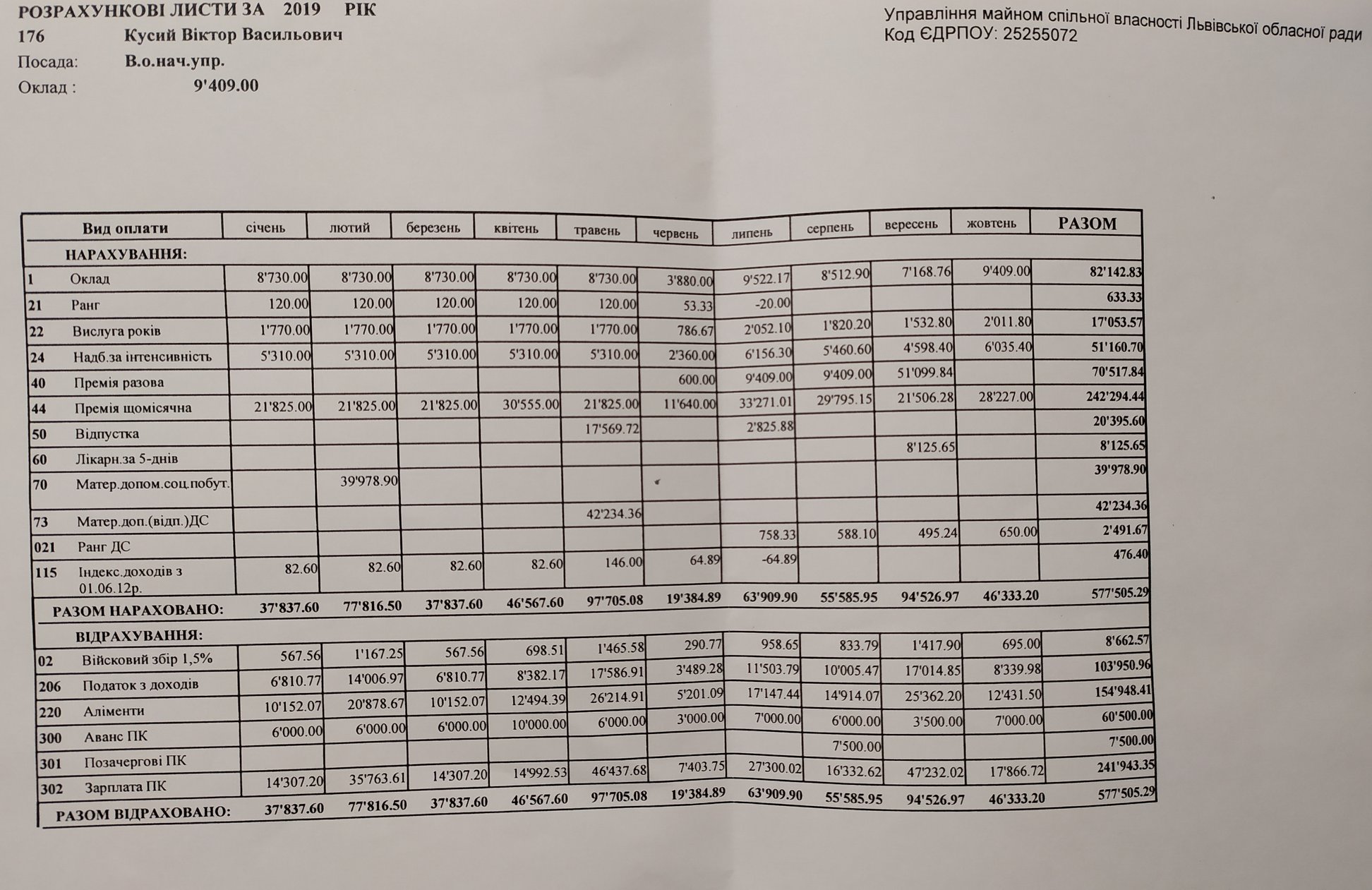 Зарплата начальника управління майном спільної власності Львівської обласної ради Віктора Кусого за 10 місяців 2019 року становила 577 тисяч грн, за деякі місяці у 2019 році – більше 90 тисяч грн.