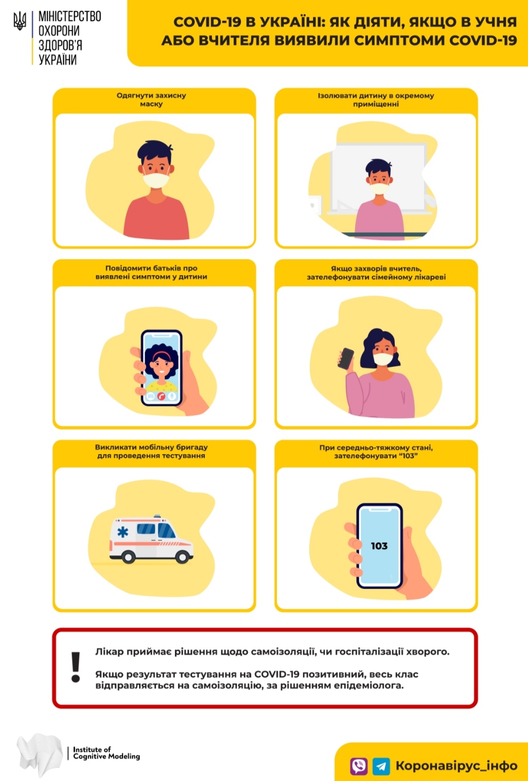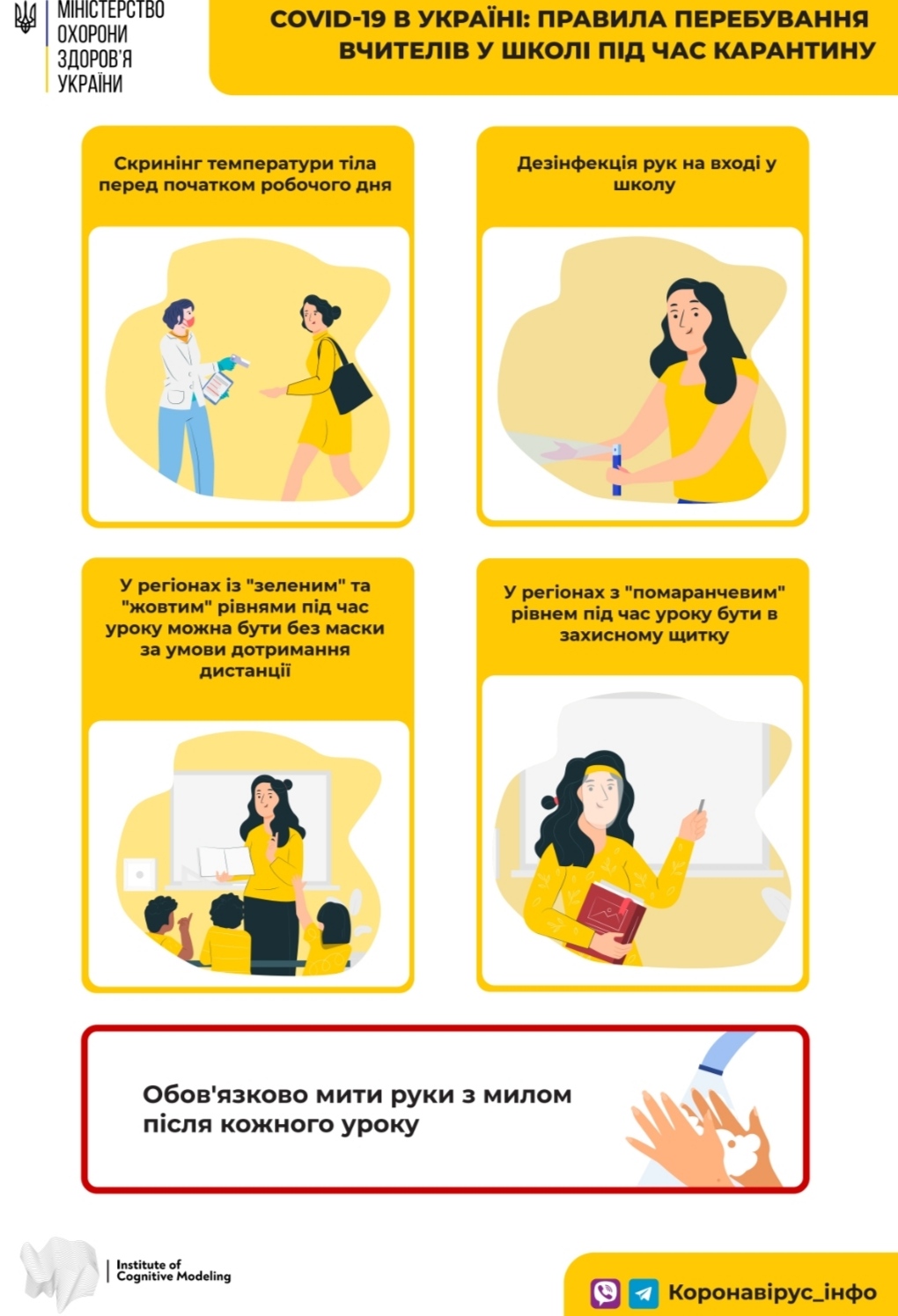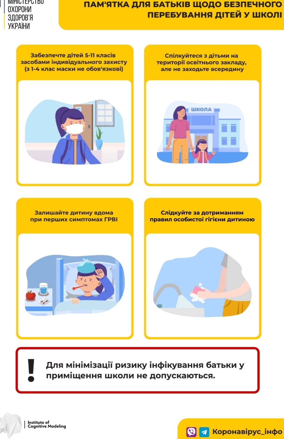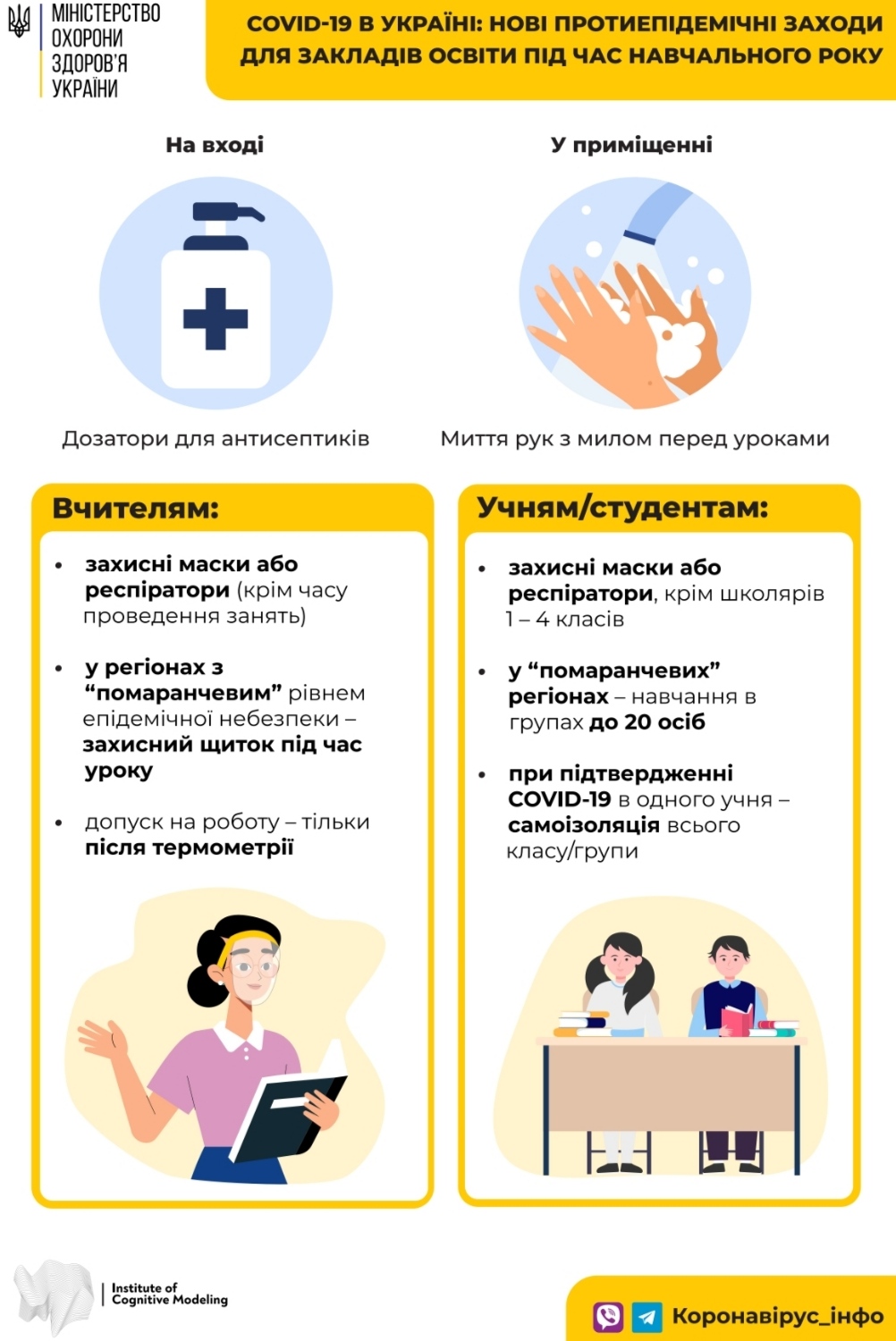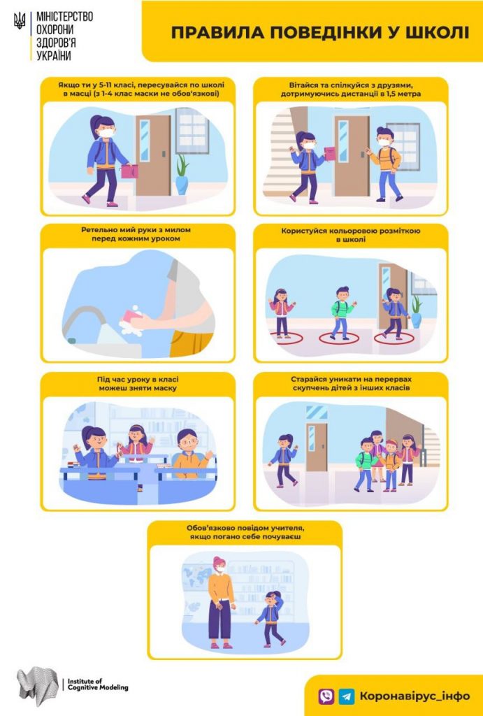 До початку навчального року Міністерство охорони здоров’я розробило карантинні правила в освітніх закладах для школярів, учителів і батьків у картинках.