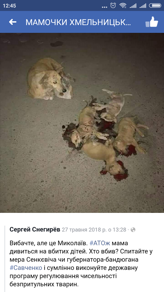 “Вибачте, але це Миколаїв. Отож, мама дивиться на вбитих дітей. Хто вбив? Спитайте у мера Сенкєвіча чи губернатора-бандюгана Савченко і сумлінно виконуйте державну програму регулювання чисельності безпритульних тварин.